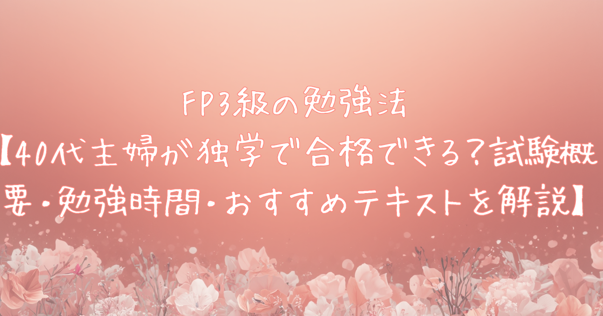 簿記3級の勉強をしている中で、家計管理や保険・年金のことも「ちゃんと学びたい」と思うようになり、FP3級の受験を決意。この記事では、40代主婦の私が感じたFP3級の難易度・勉強時間・おすすめの勉強法をまとめています。
